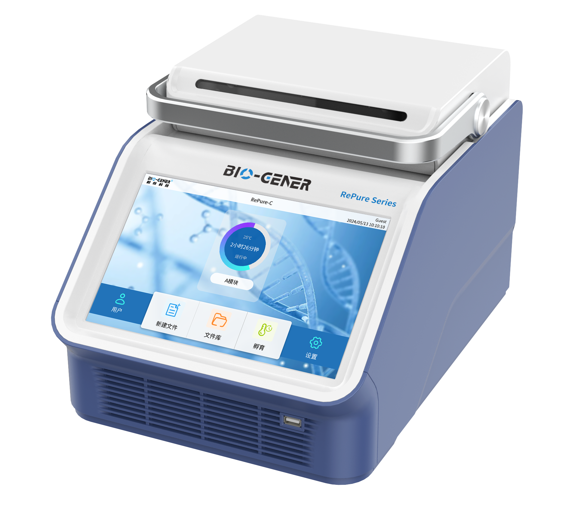 柏恒科技RePure-E采用安卓操作系統(tǒng),匹配10.1英寸電容式觸摸屏,操作簡單流暢;前進后出式風道,機器可以并排放置;自適應壓桿式熱蓋,合蓋緊蓋一步到位;采用進口溫度循環(huán)器專用長壽命Peltier模塊,循環(huán)次數大于100萬次,最大變溫速率6℃/S;內置WIFI模塊,可用手機APP控制多臺機器。