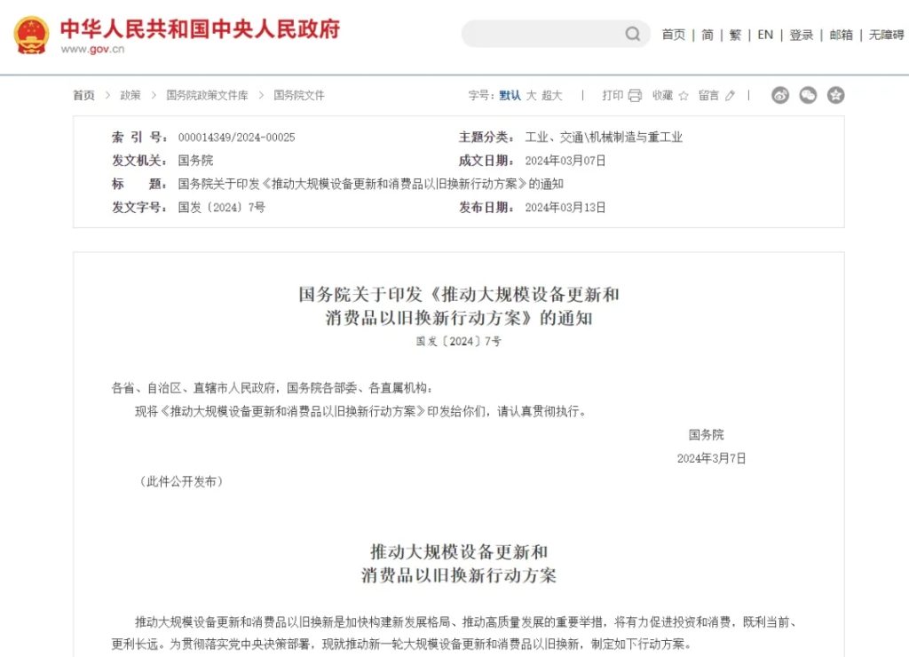 2024年2月23日,習近平總書記在中央財經委員會會議強調:加快產品更新換代是推動高質量發展的重要舉措,要鼓勵引導新一輪大規模設備更新和消費品以舊換新;2024年3月13日國務院印發《推動大規模設備更新和消費品以舊換新行動方案》,設備更新將迎來超過5萬億的市場。