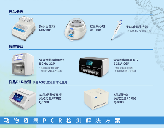 柏恒科技專注于分子生物學相關設備的生產與研發,我們的主營產品有全自動核酸提取儀、熒光定量PCR儀、等溫擴增熒光檢測儀、梯度PCR儀、離心機、金屬浴、混勻儀及相關配套產品等。在畜牧疫病防控,獸醫檢測等方面,柏恒科技相關儀器產品可以提供完備的解決方案,為畜牧等疫病的快速檢測提供助力。
